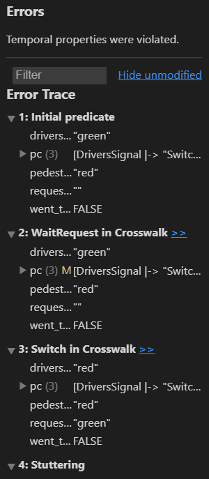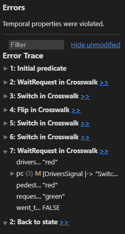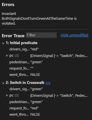DriversSignal の条件分岐を上記のように書き換えると Fig 5 に表すエラーが発生する。これは request_for_pedestrians_signal に設定した赤点灯要求は歩行者用信号にはすぐには反映されず、結果的に歩行者用信号と自動車用信号が同時に青に点灯するケースが発生しまっているためである。したがってモデルチェッカーはシステムの Safety 特性として設定した BothSignalsDontTurnGreenAtTheSameTime 違反のエラーを報告する。