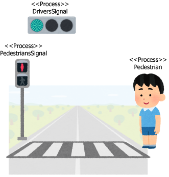 Safety 特性と Liveness 特性を実装するために、Fig 1 に示すような歩行者、歩行者用信号、自動車用信号の 3 つのプロセスで構成されるシステムを考えよう。