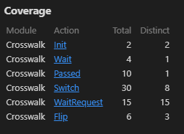 Pedestrianプロセスは歩行者用信号pedestrians_signalが"green"となっているときに進行しwent_throughフラグを立てて終了する。歩行者用信号は青と赤を繰り返すため、信号待ちのawaitでスタッターリングしないためには強い公平性fair+が必要である。 - 歩行者用信号