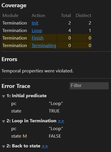 以下の例は -termination オプションを使用して livelock (無限ループ) による非終了を検出している。アルゴリズムに 2 つ以上のステップが存在しないと内部的な状態変数 pc が作成されず Termination 定義が見つからないというエラーとなることに注意。