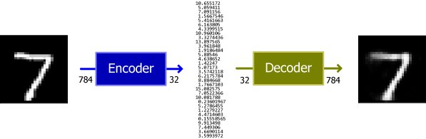 最もシンプルなオートエンコーダーは全結合層のエンコーダー/デコーダーのみで構成できる。Fig.2 は 28×28=784 ピクセルのグレイスケール MNIST 画像を 32個の特徴量に変換し、その特徴量から元の画像を復元している。