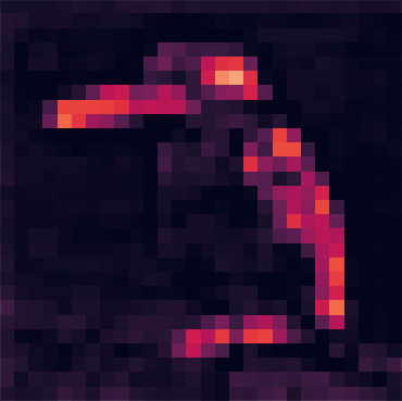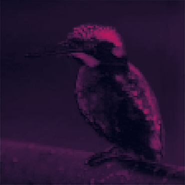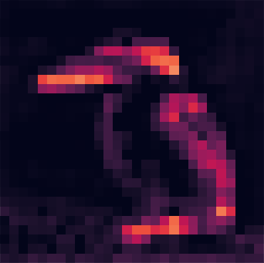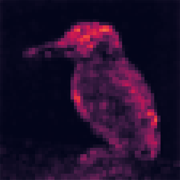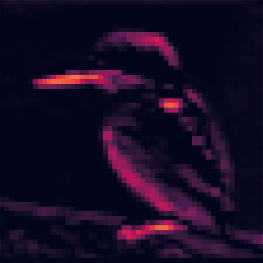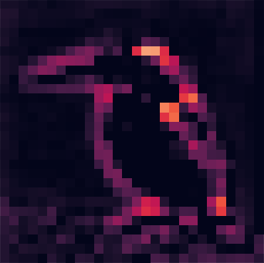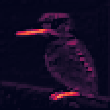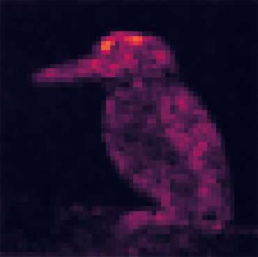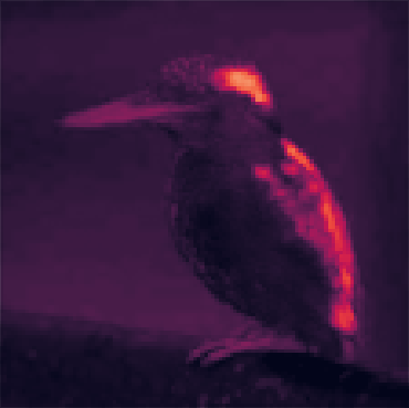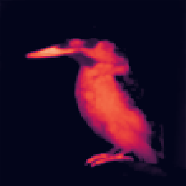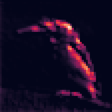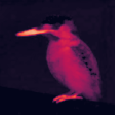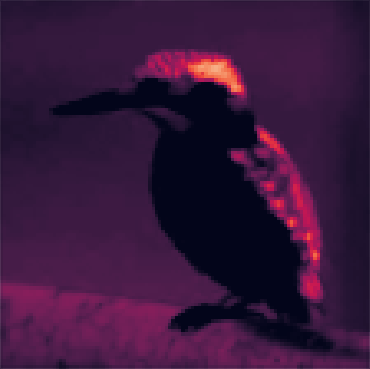 特徴強度を表す行列はその部分の活性化の強度を表している。つまり行列をヒートマップ化し元の画像の等倍に引き延ばして重ねると、画像のどの部分を特徴としてとらえる特徴強度かを可視化することができる。この例の特徴強度はカワセミのくちばしと足の組み合わせを特徴として認識していることがうかがえる。