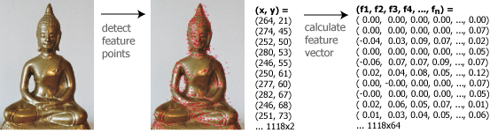 例として仏像、車、ギターの画像を検索のためにインデックス化する。下の図では仏像の画像から 1118 個の特徴点が検出され、それぞれ 64 次元の特徴ベクトルが算出されている。