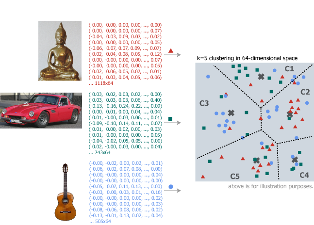 検索対象のすべての画像に対してこれらの特徴ベクトルを算出し、\(n\) 次元空間に配置して \(k\) 個のクラスタとそれぞれの重心 (あるいはコードブック) を抽出する。下のイメージ図は便宜上 2 次元にしているが実際は \(n\)=64 次元空間を \(k\)=5 クラスタに分割している想定。