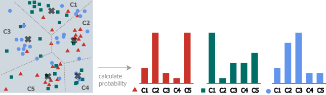 - すべての特徴量を \(n\) 次元空間上に配置し \(k\) 個の特徴クラスタに分割してそれぞれの重心を算出する