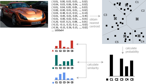 ここで 1)局所特徴量の求め方 2)クラスタリング方法 3)クラスタの所属判定 4)分布類似度の求め方などのアルゴリズムは考慮の余地があるだろう。