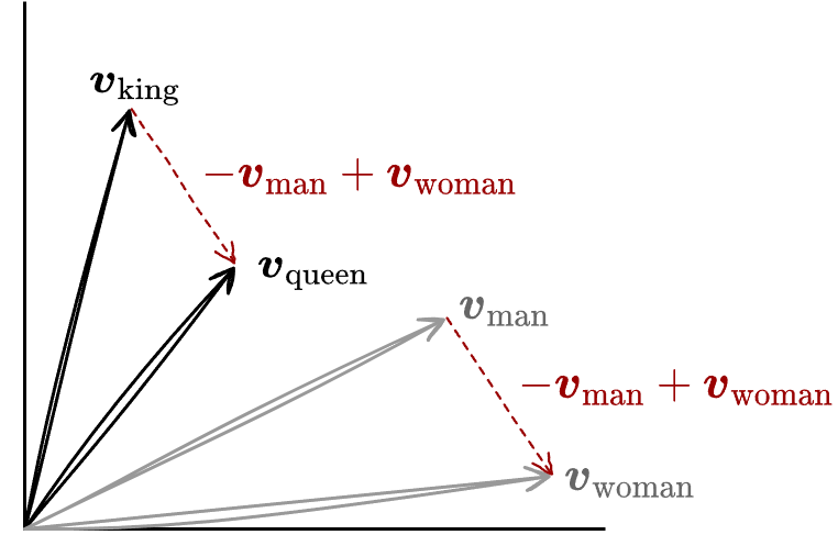 word2vec によって得られた単語ごとの数値は特徴空間上の点、つまり特徴ベクトルと見なすことができる。近接する点が意味的に類似し、その距離と方向も意味的な差異を表していることを示唆している。\(\vector{v}_{\rm X}\) を単語 X の特徴ベクトルとしたとき、Fig 2 に示すように \(\vector{v}_{\rm king} - \vector{v}_{\rm man} + \vector{v}_{\rm woman}\) の演算結果が \(\vector{v}_{\rm queen}\) の近傍になるという結果が経験的によく知られている。これは各単語の特徴ベクトル表現が現実の特徴を演算可能な差異として表していると考えることができる。