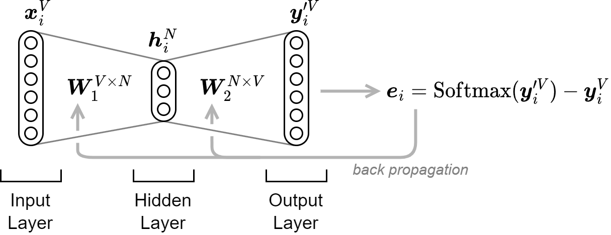 モデルの重み \(\vector{W}_1\) と \(\vector{W}_2\) は乱数を初期値として構築する。そしてイテレーションごとに誤差に基づいた調整が行われる。まず式 (\(\ref{softmax}\)) で算出した実際の出力値 \(\vector{Y}'_s\) と想定する出力値 \(\vector{Y}\) との差 \(\vector{E}\) を算出する。\[ \begin{equation} \vector{E} = \vector{Y}'_s - \vector{Y} \in \mathbb{R}^{S \times V} \label{error} \end{equation} \] 式 (\(\ref{error}\)) に基づいて式 (\(\ref{backpropagation}\)) によってモデルの重み行列 \(\vector{W}_1\) と \(\vector{W}_2\) を調整する。ここで \(\alpha\) は調整をどれだけ強く反映させるかを示す学習率 (learning rate) である。\[ \begin{equation} \left\{ \begin{array}{l} \vector{W}'_1 = \vector{W}_1 - \alpha (\vector{X}^\mathsf{T} \cdot (\vector{E} \cdot \vector{W}_2^\mathsf{T})) \ \in \mathbb{R}^{V \times N}\\ \vector{W}'_2 = \vector{W}_2 - \alpha (\vector{H}^\mathsf{T} \cdot \vector{E}) \ \in \mathbb{R}^{N \times V} \end{array} \right. \label{backpropagation} \end{equation} \]