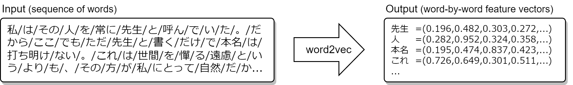 word2vec は入力層、隠れ層、出力層の 3 層のニューラルネットワークで構成されている。入出力はともに単語であり、ある単語とその近傍の単語の生起確率が最適となるように学習させることで、その隠れ層を生成する重みが単語ごとの特徴ベクトルとなる。3 層の word2vec は深層ニューラルネットワーク (DNN) ではないが、テキストを DNN が解釈できる数値形式に変換するための前処理として使用されることが多い。