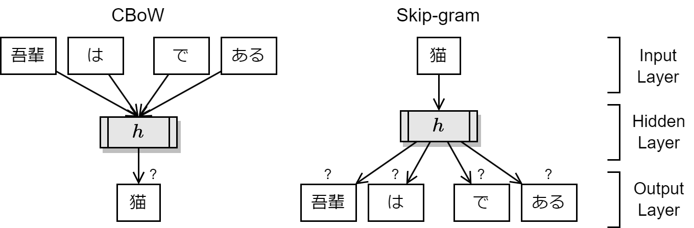 word2vec のアルゴリズムには CBoW (continuous bag of words) と Skip-gram の 2 種類がある。一連の単語シーケンスが与えられたとき、CBoW は単語の近傍 (文脈) から単語を予測するように学習する。Skip-gram は逆に単語からその近傍の単語を予測するように学習する。大規模なデータセットに対しては Skip-gram の方が正確な結果が得られる傾向にあることから Skip-gram がよく使用されている。