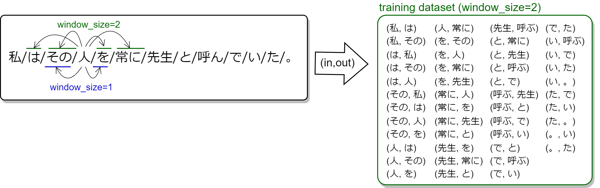 文を超える近傍は意味の関連が薄いため、文頭の前や句点の後には単語が存在しないものとして、文単位でデータセットを構築する。