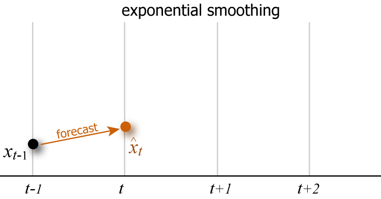 指数平滑化法は新しい期待値を算出するために直前の観測値と期待値のみを使えば良く \(t\) が非常に大きくなるような時系列では計算効率が良い。