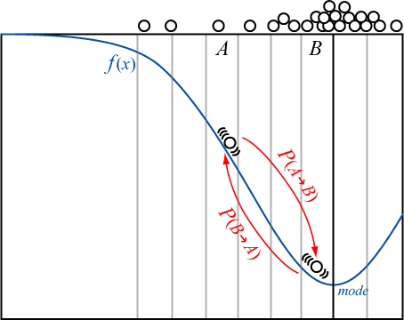 以下の詳細釣り合い条件 (detailed condition of equilibrium) を満たす確率分布において状態 \(A\), \(B\) 間を確率付きのランダムウォークで移動するとき、どちらの状態にいるかの確率はステップ数が十分に大きくなれば平衡状態 (不変分布) に収束する。\[ P_A P(A\to B) = P_B P(B\to A) \]