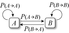 状態 \(A\) から \(B\) へ遷移する確率を \(P(A\to B)\)、\(B\) から \(A\) へ遷移する確率を \(P(B\to A)\) とする。