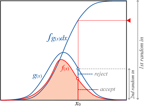 3-4 は \(u\in[0,1)\) の乱数を生成して \(u\lt\frac{f(x)}{g(x)}\) を評価しても良い。