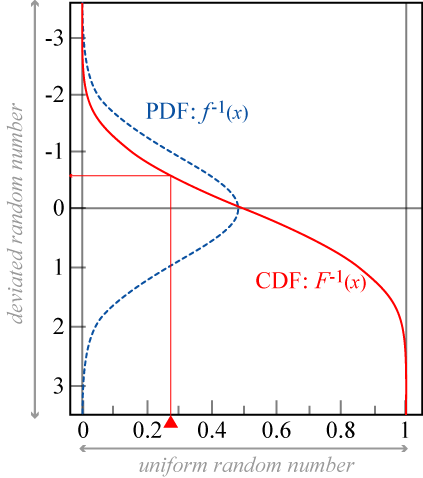 ある確率密度関数 \(f(x)\) に対して、その累積分布関数 (CDF; cumulative distribution function) の逆関数 \(F^{-1}(x)\) に一様乱数 \(0 \leq r \lt 1\) を適用することで分布 \(f\) に従う乱数を解析的に得ることができる。この手法を逆関数法 (inverse transform sampling) または逆確率積分変換 (inverse probability integral transformation) と呼ぶ。