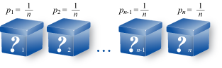 \(n\) 個の箱のいずれかを当たりとする。この時、何の事前条件もないため各箱の当たりの確率は均等に \(\frac{1}{n}\) である。