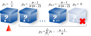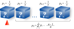回答者が選んだ箱が当たりである確率は \(p = \frac{1}{n}\)。他方、回答者が選ばなかった \(n-1\) 個の箱に当たりが含まれる確率は \(p_X = \frac{n-1}{n}\) である。