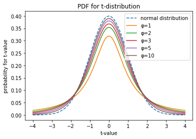 t 分布は正規分布に似た釣鐘状の連続分布である。Fig 1 に示すように正規分布より中心が低く裾野が太い特徴を持つ (つまり平均から離れた値を許容する傾向を持つ)。t 分布の形状は自由度 (degree of freedom) と呼ばれるパラメータ \(\phi\) によって決まり、自由度が大きくなるに連れて平均 0、分散 1 の標準正規分布に近似する。