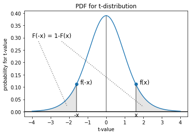 Fig 2 に示すように t 分布が左右対称であることを考慮し、ある量 \(\tau \ge 0\) より外側の片方の確率 (面積) を \(\rho(\tau)\) = \(F_\phi(-\tau)\) = \(1-F_\phi(\tau)\) で表すと、人に説明する言葉では: