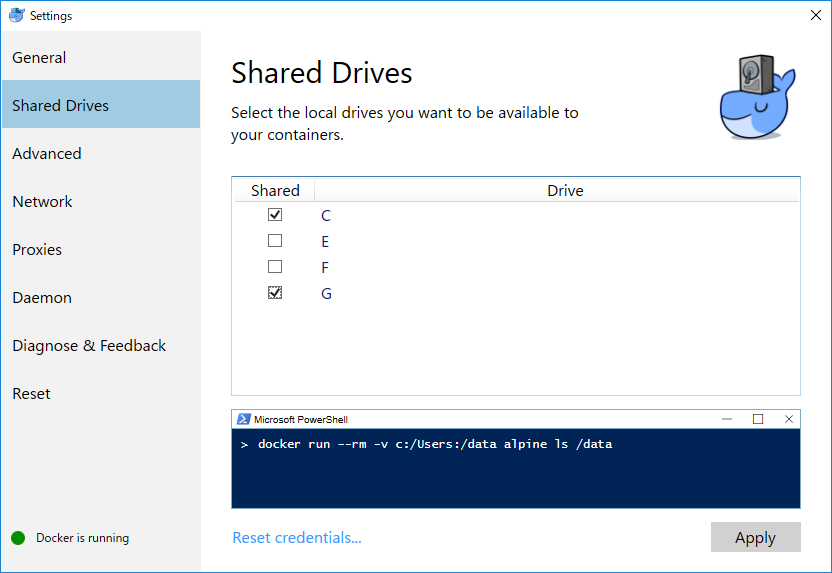 最初に Docker の設定でマウントするディレクトリのドライブに共有の許可が与えられているかを確認しておく。許可が与えられていない場合はコンテナ側からはディレクトリのみファイルが存在しないように見える。