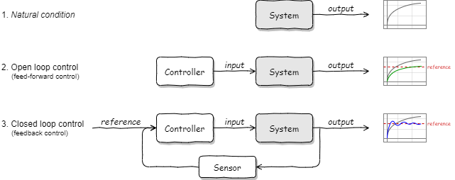 ある状態予測モデルに基づいて (系の実際の出力を観測することなく) コントローラが入力を制御する方法をフィードフォワード制御 (feed forward control; 予測制御) または開ループ制御 (open loop control) と呼ぶ。一方で、系の実際の出力と参照値 (目標値) との差に基づいてコントローラがアクションを起こす制御をフィードバック制御 feedback control) または閉ループ制御 (closed loop control) と呼ぶ。参照値は時間によって変化する可能性があることに注意。
