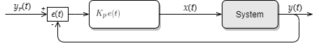 目標とする参照値 \(y_r(t)\) と実際の出力 \(y(t)\) との差 \(e(t)=y_r(t)-y(t)\) を偏差としたとき、現在の偏差 \(e\) を定数 \(K_p\) 倍したフィードバック制御を P 制御 (proportional control; 比例制御) と呼ぶ。P 制御は単純な制御方式だが不安定な制御対象の外乱を抑止して安定させる効果がある。