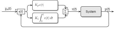 偏差 \(e(t)\) の時間積分を定数 \(K_i\) 倍した積分制御項を P 制御に加えたものを PI 制御 (P+integral control; 積分制御) と呼ぶ。