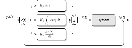 PID 制御は式 (\(\ref{pid}\)) のように表される。\[ \begin{eqnarray} e(t) & = & y_r(t) - y(t) \nonumber \\ x(t) & = & K_p e(t) + K_i \int_{\tau=0}^t e(\tau)\, d\tau + K_d \frac{d\, e(t)}{dt } \label{pid} \end{eqnarray} \]
