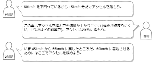 P 制御が現在の偏差のみを考慮するのに対して、I 制御は過去の偏差の推移を考慮し、D 制御は将来の偏差の推移を考慮する。例えば自動車の速度制御が目標値を 60km/h としてた場合、PID それぞれの制御は 55km/h という現在の速度からアクセルの踏みの強さを以下のように考慮するかもしれない。