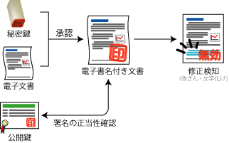 電子署名 (digital signature) は文書に対する承認と、文書内容の保障を電子的に付け加えるための暗号技術。公開鍵を使用することにより他人によって行われた署名でないことと、署名された時点から文書内容に変更がないことの 2 点を証明することができる。また電子署名法