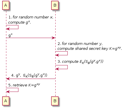 - B: \(g^y\), \(E_K(S_B(g^y,g^x))\) を A に送信する。
