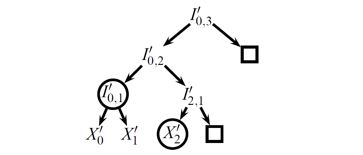 同様に、Figure 3 に示す \(P\) からノード \(X_3\) と \(X_4\) が \(\square\) であると仮定し、以前と同様に内部ノードのハッシュをルートまで再計算することによって、バージョン 2 のコミットメント \(C_2\) を再構築できる。\(C'_2 = C_2\) であれば、Figure 1 と Figure 3 で丸で囲まれた、剪定ツリー \(P\) と \(C'_2\) によってコミットされた暗黙のツリーに対応するノードは一致しなければならない、つまり \(I'_{0,1} = I_{0,1}\) かつ \(X'_2 = X_2\) となる。