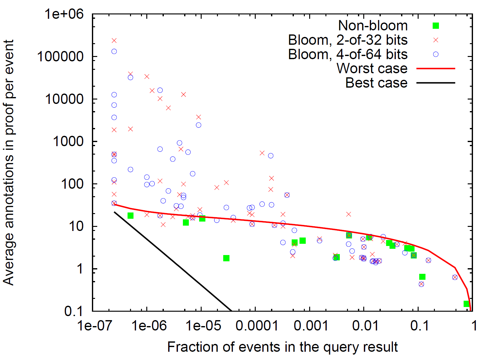 Merkle 集約と認証済みクエリー結果. 我々の第 2 のテストでは Merkle 集約クエリーの検索結果のオーバーヘッドを調査する。ロガーがクエリーの結果を生成すると、結果として得られる剪定ツリーには一致したイベントトイレ器ツリーのオーバーヘッドの両方が、スタブのハッシュと属性の形式で含まれる。各述語について、我々はクエリーオーバーヘッド比率を測定する。これは、剪定ツリー内のスタブと内部ノードの数を剪定ツリー内のイベント数で割ったものである。Figure 10 では我々の 86 の述語それぞれについてクエリーオーバーヘッド比率とクエリーに一致するイベントの割合をプロットしている。このプロットは述語に一致する各イベントについて、認証情報のために 1 イベントあたりどれだけの追加オーバーヘッドが発生しているかを比例的に示している。我々はまた連続近似に基づく解析的な裁量ケースと最悪ケースの境界もプロットする。最小オーバーヘッドは一致するイベントがログ内で連続している場合である。