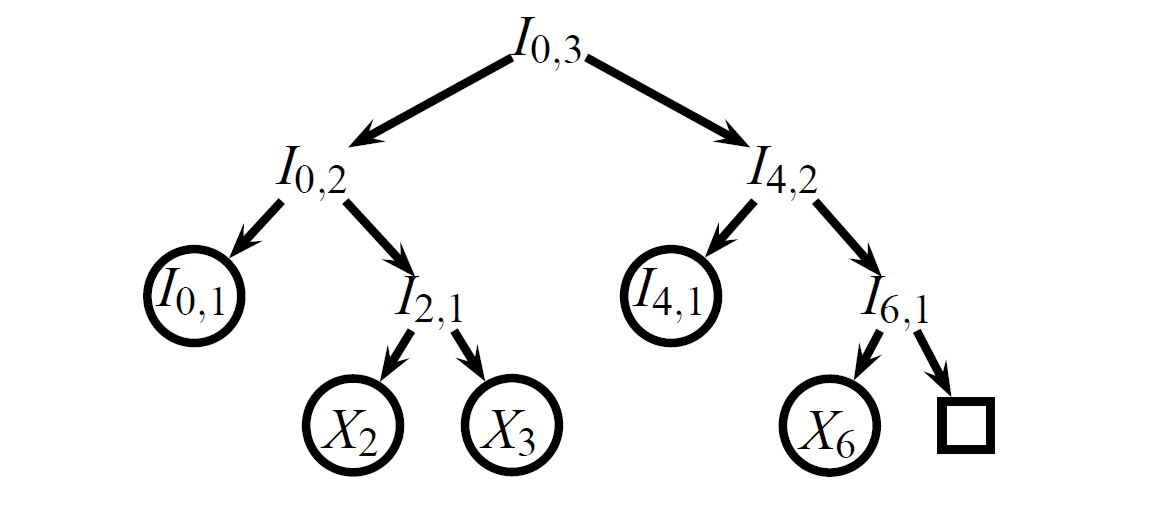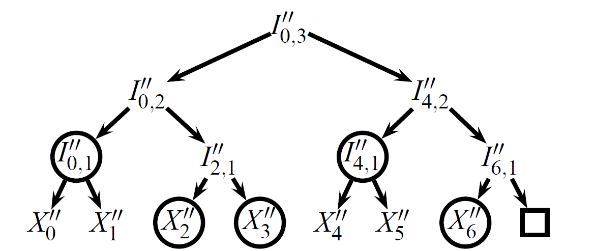 深さ \(d\) の満たされた履歴ツリーは、葉に \(2^d\) 個のイベントを保持する Merkle ハッシュツリーである。内部ノード \(I_{i,r}\) はインデックス \(i\) と層 \(r\) で識別される。層 0 にある各葉ノード \(I_{i,0}\) はイベント \(X_i\) を格納する。内部ノード \(I_{i,r}\) は、左の子 \(I_{i,r-1}\) と右の子 \(I_{i+2^{r-1},r-1}\) を持つ (Figure 1 から Figure 3 がこの番号付けスキームを示している)。ツリーが満たされていない場合、イベントを含まない部分木は \(\square\) として表現される。これは、Figure 1 に示されている 3 つのイベントを持つバージョン 2 ツリーから見ることができる。Figure 1 は 4 角イベントを追加したバージョン 6 のツリーを示している。図のツリーは深さ 3 を持ち最大 8 個の葉を保存できるが、この設計がより深くより多くの葉を持つツリーにも拡張できることは明らかである。