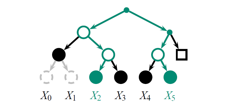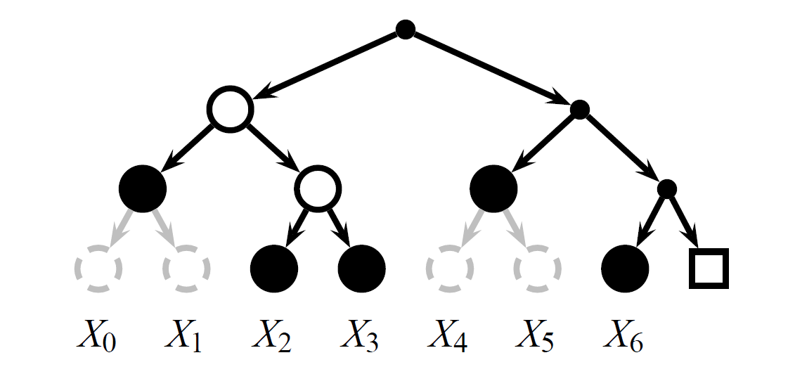これで履歴ツリーを定義したので、我々はロガーによって生成される増分証明について説明する。Figure 4 は \(C_2\) から \(C_6\) への増分証明を表す、Figure 3 で与えられた証明と等価な剪定ツリーを抽象的に示している。ドットはハッシュがその子ノードから計算される非凍結ノードを表す。白い丸はハッシュがその子ノードから再計算できるため証明に含まれない凍結ノードを表す。黒い丸は、葉またはスタブであるため証明に含める必要のある凍結ノードを表す。灰色のノードは剪定ツリーに含まれない省略された部分木を表す。この剪定ツリーと (Figure 5 に示す) 式 (\(\ref{eq1}\))-(\(\ref{eq4}\)) から \(C_6 = A_{0,3}^6\) であり、かつ以前のバージョン 2 のビューからコミットメント \(A_{0,3}^2\) を計算できる。