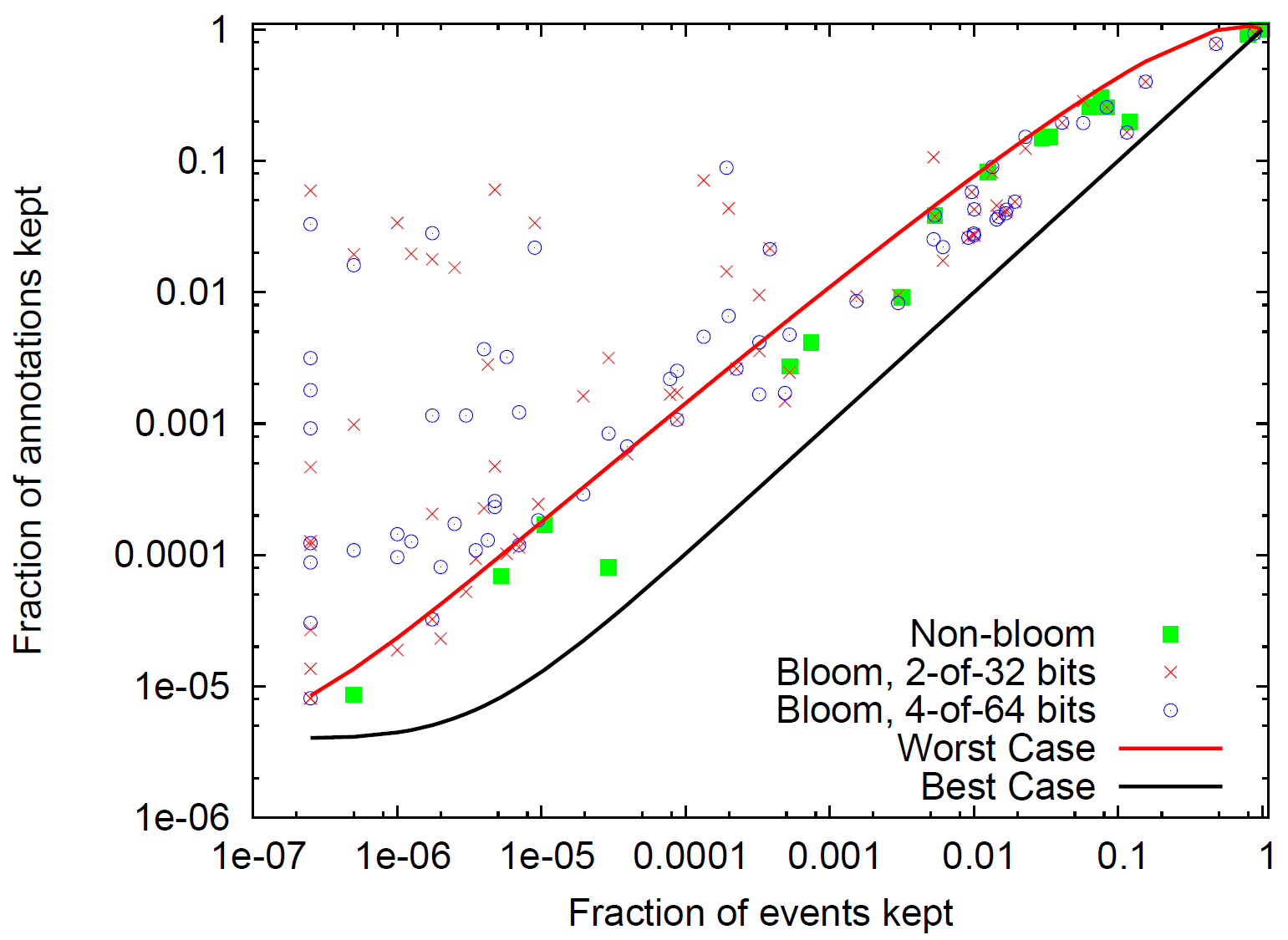 タグとホストに一致する述語はブルームフィルターを使用しており、不正確 (inexact) であり偽陽性が発生する可能性がある。そのため、65 個のブルームフィルタークエリー結果のうちの 34 が、正確な述語に対する我々の "最悪ケース" の期待値よりも多くのノードを含む結果となった。より大きなブルームフィルターを使用することで誤った一致の可能性を軽減する。タグとホスト名に 64 ビット中 4 ビットのブルームフィルターを使用すると、検索クエリーから生成される剪定ツリーでは、履歴ツリーの各ノードに 64 ビットの属性が追加で必要になるが、ノード数は平均 15% 減少する。実際の実装では、ブルームフィルターの正確なパラメータはログに記録されるイベントのサンプルに合わせて調整するのが最適である。