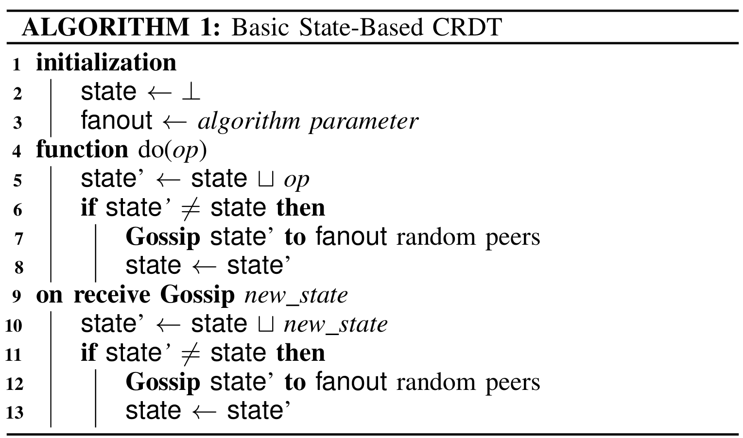 我々の手法は MST を使わない ALGORITHM 1 の基本形式に示される状態ベース CRDT の単純な分散状態更新手法に基づいている。ALGORITHM 1 はリアクティブゴシップ戦略を採用している。ノードが \(x_0\) から \(x_1\) へ状態遷移を伴う操作を行う場合 (ここで \(x_1 = x_0 \sqcup o\) とする)、これは \(x_1\) をいくつかのランダムピアにゴシップする。ノードが状態 \(x'_0\) にあるときに状態 \(x_1\) を受信すると、\(x'_0 \sqcup x_1 = x'_1\) への遷移を行い、\(x'_1 \ne x'_0\) の場合、今度は \(x'_1\) をいくつかのランダムピアにゴシップする。ランダムピアの選択には、ネットワークからランダムに選ばれたノードの ID を取得できるピアサンプリングサービス [14] を前提としている。