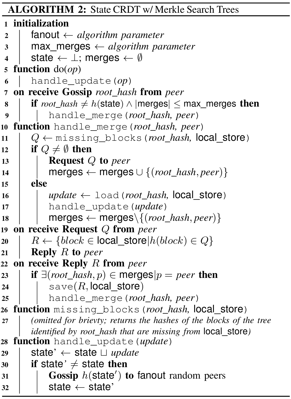 ALGORITHM 1 を使用して集合や Key-Value ストアなどの大規模マップ型 CRDT を実装する場合、状態全体を交換するような単純な実装はすぐに扱いにくくなる。このような場合、MST を用いることで、ノード間の複数回のラウンドトリップをコストにするだけで、ネットワーク帯域幅の使用量を大幅に削減できる。ALGORITHM 2 は、ローカル操作をブロックすることなくバックグラウンドでこれを実現する方法を示している。マージに必要なリモート情報がすべて取得されるまで (12 行目) この状態に対して get 操作や update 操作を実行し続けることができる。このアルゴリズムでは、マージしたいリモート MST のセットがバッファに保持され (4, 14, 18 行目)、欠落しているすべてのブロックがリモートピアに要求される (13 行目)。すべてのブロックがローカルで利用可能になると、ネットワーク通信成しにマージ操作が実行され (16 行目) ローカル MST が更新される。