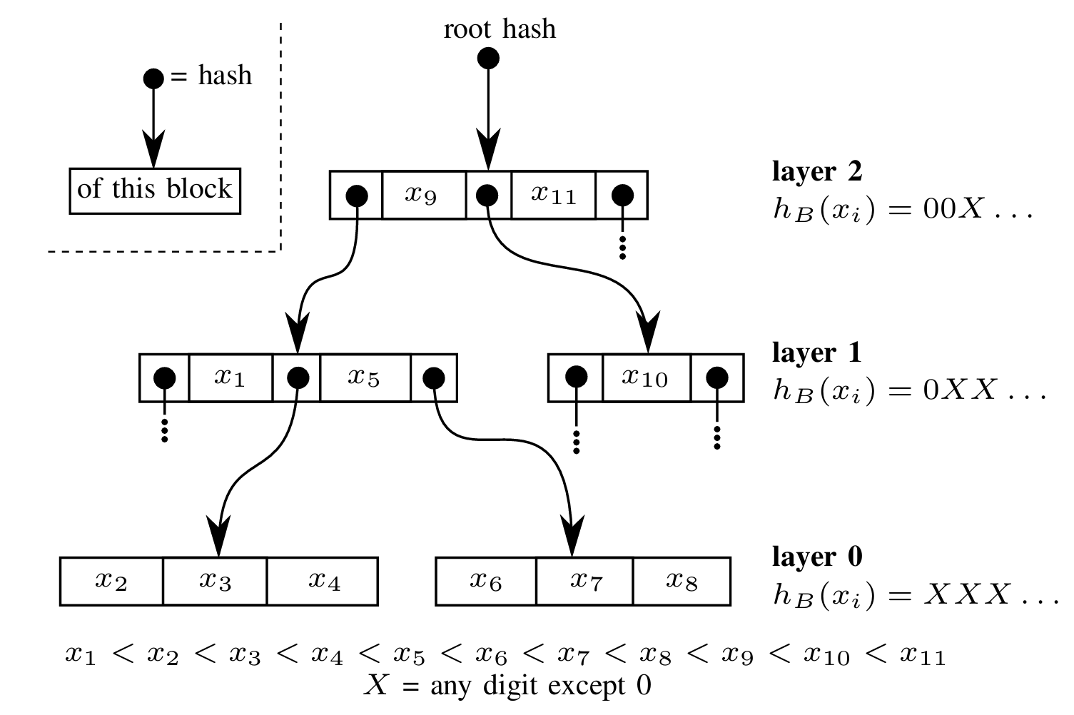 MST は検索木であり、内部のツリーノードが複数の値を持ち、その値が \(\mathbb{K}\) のパーティションを定義し、そのパーティション内で子の値が分離されるという点で B-Tree に似ている。木は層に分割され、層 0 は葉ノードの層に対応する (Figure 1)。層 1 のツリーノードは連続する項目のブロックであり、その境界は \(l' \gt l\) の項目に対応する。例えば Figure 1 では、層 0 の最初のノードには境界 \(x_1\) と \(x_5\) の間に含まれる値 \(\{x_2\), \(x_3\), \(x_4\}\) が格納されており、\(x_1\) と \(x_5\) はレイヤー 1 に格納されている。以前の構成 [20] と同様に、値をハッシュすることで得られる決定論的なランダム性を使用して木の形状が決定される。MST に格納される値は、ハッシュを計算し、その値を基数 \(B\) の進数で記述することによって層が割り当てらる。これを \(h_B(x)\) と呼ぶ。項目 \(x\) が割り当てられる層 \(l(x)\) は、\(h_B(x)\) においてゼロのみで構成される最長プレフィクスの長さと同じ番号の層である。