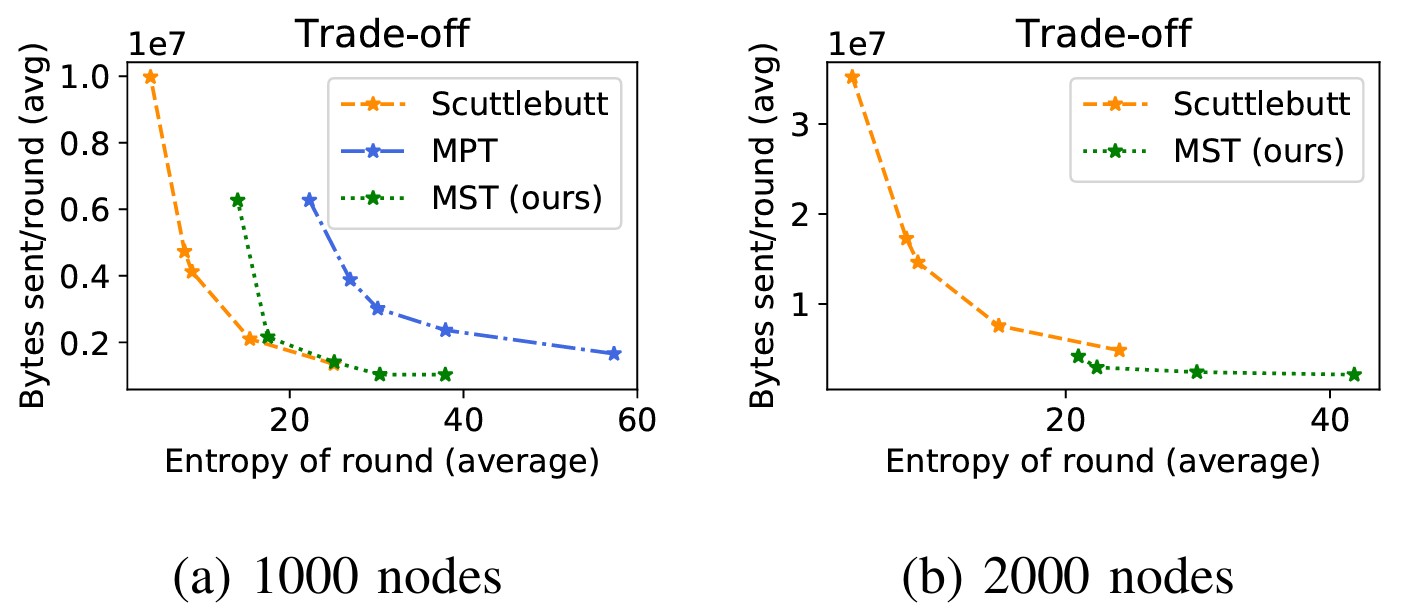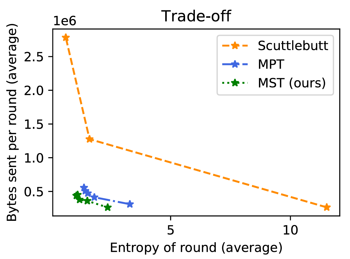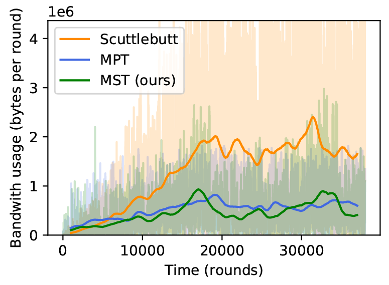 我々は、我々のアルゴリズム (セクション V-B) を 2 つの競合アルゴリズムと比較した。一つ目はセクション V-A で説明した Scuttlebutt 調整アルゴリズム、二つ目はマークル木の 2 番目の構成である、項目のハッシュに基づくマークル符号化されたプレフィクス木 (マークルプレフィクス木 (Merkle Prefix Tree) または MPT) である。