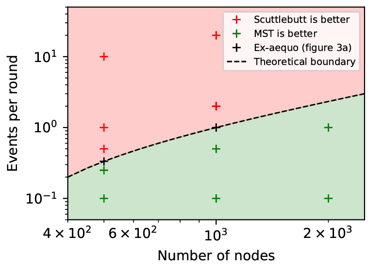 3) どのような場合に我々の方が良いか?: Figure 5 に、マークル検索木が Scuttlebutt 手法よりも適している条件を分ける理論的な境界を示した。この境界は TABLE II の理論的結果に基づいて境界での等価性を記述し、アンチエントロピーラウンドにおける差異数 \(d\) をネットワーク内のイベント発生率 \(r\) に置き換えることで使用された: \[ \alpha p + \beta r = r \log_B n \] ここで \(p\) はシミュレーションにおけるプロセス数である。\(\log_B n\) は定数とする (これは \(\log_B N\) と等しく、\(N\) はシミュレーションで生成されるイベントの総数である)。項を並べ換えるとアフィン境界が得られる: \[ r = ap + b \] この境界を 2 つのシミュレーションで較正したところ、どちらの手法も良好なパフォーマンスを示した。1 つは \(p=1000\), \(r=1\) の Figure 3(a) であり、もう 1 つは示されていないが、\(p=500\), \(r=.33\) である。Figure 5 のプロットには完全なシミュレーション集合を実行した実験較正も示されており、各手法が優位性を持つ領域が明確に示されている。