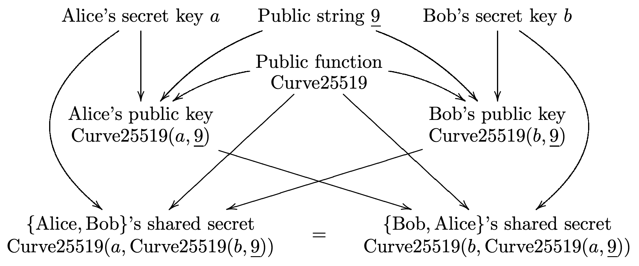 共有シークレット \({\rm Curve25519}(a, {\rm Curve25519}(b, \underline{9}))\) のハッシュは秘密鍵認証システムの鍵として (メッセージ認証のために) 使用されるか、もしくは秘密鍵認証暗号システム (同様に暗号化とメッセージ認証のために) として使用される。