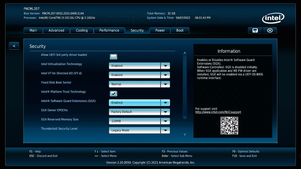PRM 領域はハードウェア起動時から専有され一般のアプリケーションから利用できないため BIOS のデフォルト設定で SGX が無効化されていることがある。SGX 対応ハードウェアでありながらテストプログラムで sgx N supported: 0 と表示されている場合は BIOS 設定を確認する必要がある。