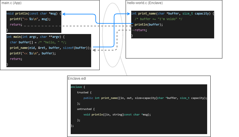 開発者は Untrusted なメモリ空間で実行される App コードと、Trusted なメモリ空間で実行される Enclave コードを作成し、それらの間で互いに呼び出し可能な関数を定義した EDL ファイル (IDL の Enclave 版) を作成する。この EDL は App, Enclave のコンパイル前に