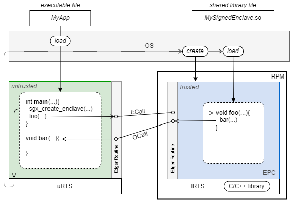 SGX に対応したアプリケーションが保護メモリ空間で実行したいライブラリのロードを要求すると、保護メモリ空間にアプリ用の Enclave が割り当てられ、その隔離された空間にライブラリがロードされる。保護されていない通常の実行を行うコードとは (SGX の命令を介するものの) 関数レベルで相互に呼び出しが可能である。