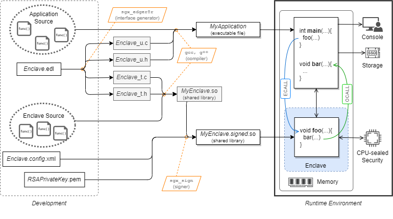 App コードは gcc や g++ を使って一般的な実行ファイル (または静的ライブラリ libXXX.a や共有ライブラリ YYY.so) にビルドすることができる。他方、Enclave コードは共有ライブラリとしてビルドしたあと、秘密鍵で署名することで Enclave 上で動作することができる。
