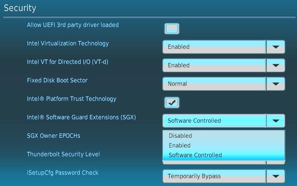Secure Boot を無効化して上記のメッセージが表示されなくなっても、intel_sgx: SGX is not enabled と表示されデバイスファイルが現れないことがある。これは SGX を Disabled または Software Controlled にしているときに表示されるメッセージである (Linux の Out-of-tree ドライバは Software Control に対応していないのかもしれない)。これは BIOS で SGX を明示的に Enabled にすることで回避できる。