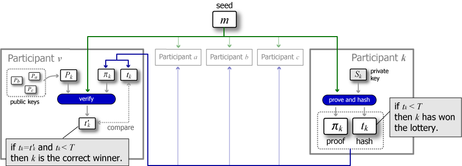 各参加者 \(k\) がそれぞれ自身の秘密鍵 \(S_k\) とシード \(m\) から証明 \(\pi\)、乱数 \(t\) を計算し、その乱数がしきい値 \(T\) より小さければ自分が当選したと判断する。当選者はその証明と共に権利を行使し、検証者に \(\langle m, \pi, t \rangle\) を送信する (全ての参加者が検証する場合は全ての参加者に)。