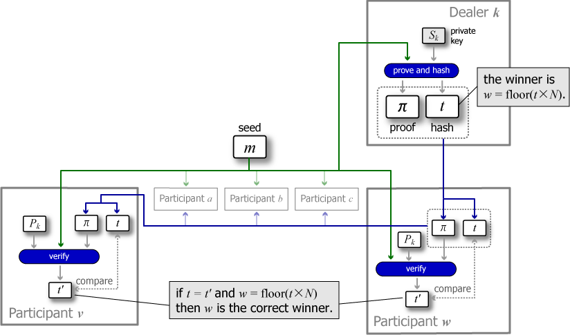 val pi = vrf_prove(Sk, m) val t = vrf_hash(pi) - 参加者はディーラーの公開鍵 \(P_k\) とシード \(m\)、証明 \(\pi\) を使用して乱数 \(t\) を検証し、当選者を認識する。